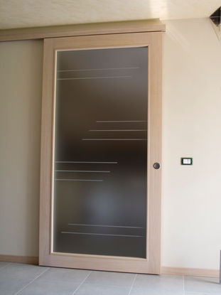 Scorrevole esterno muro con kit di scorrimento, veletta di copertura, battuta d'arrivo, realizzata in essenza di legno di ROVERE con la possibilità di scegliere il tipo di tranciato, venatura verticale, orizzontale o a disegno. Foro vetro rettangolare o a disegno. Prodotte internamente dalla nostra produzione interna. La finitura può essere laccata a poro aperto nelle tinte RAL, NCS o a campione, verniciate tinta legno, naturale, sbiancate o a campione per accompagnamento.